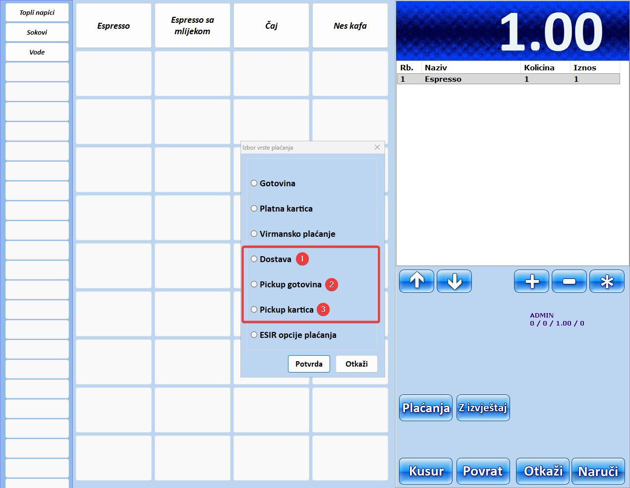 - Pickup gotovina (2) - koristi se kada krajnji kupac narudžbu izvrši preko aplikacije i istu tu narudžbu pokupi iz lokala plaćajući gotovinom