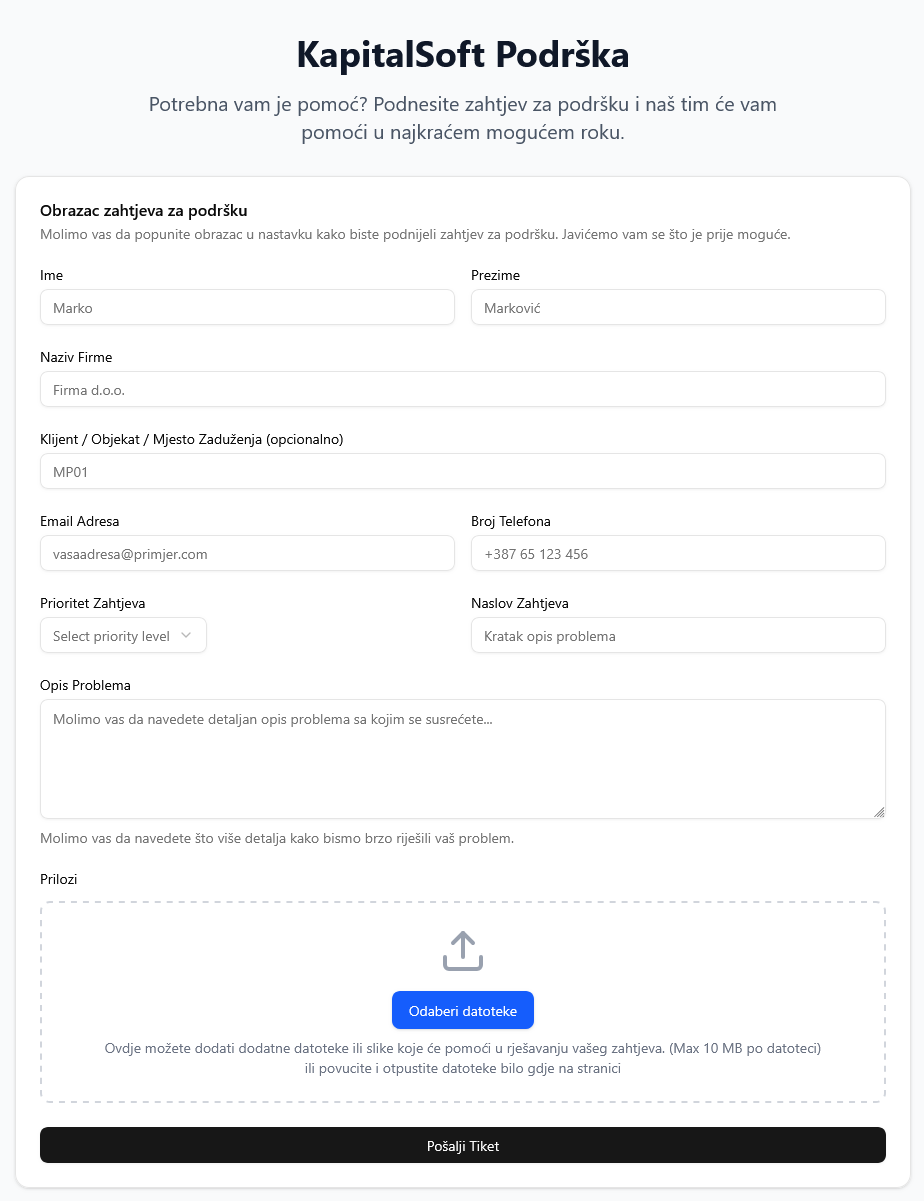 Korištenje ticketing sistema je jednostavno. Potrebno je kreirati novi tiket unosom kratkog naslova i detaljnog opisa problema, uz mogućnost dodavanja priloga (slika ili fajlova relevantnih za rješavanje zahtjeva).